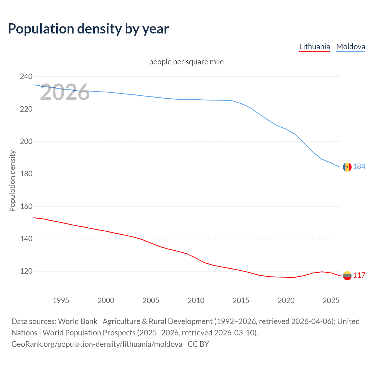 From 2006 to 2026, population density in Lithuania decreased by 13.3%, compared to a 18.8% decline in Moldova.
