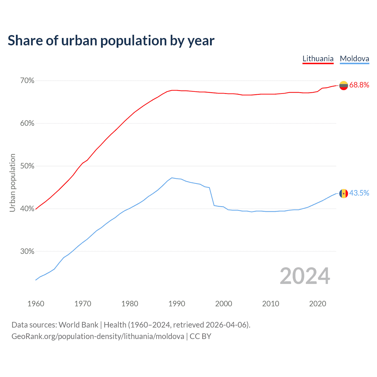 From 2004 to 2024, the share of urban population changed from 66.6% to 68.8% in Lithuania and from 39.4% to 43.5% in Moldova.