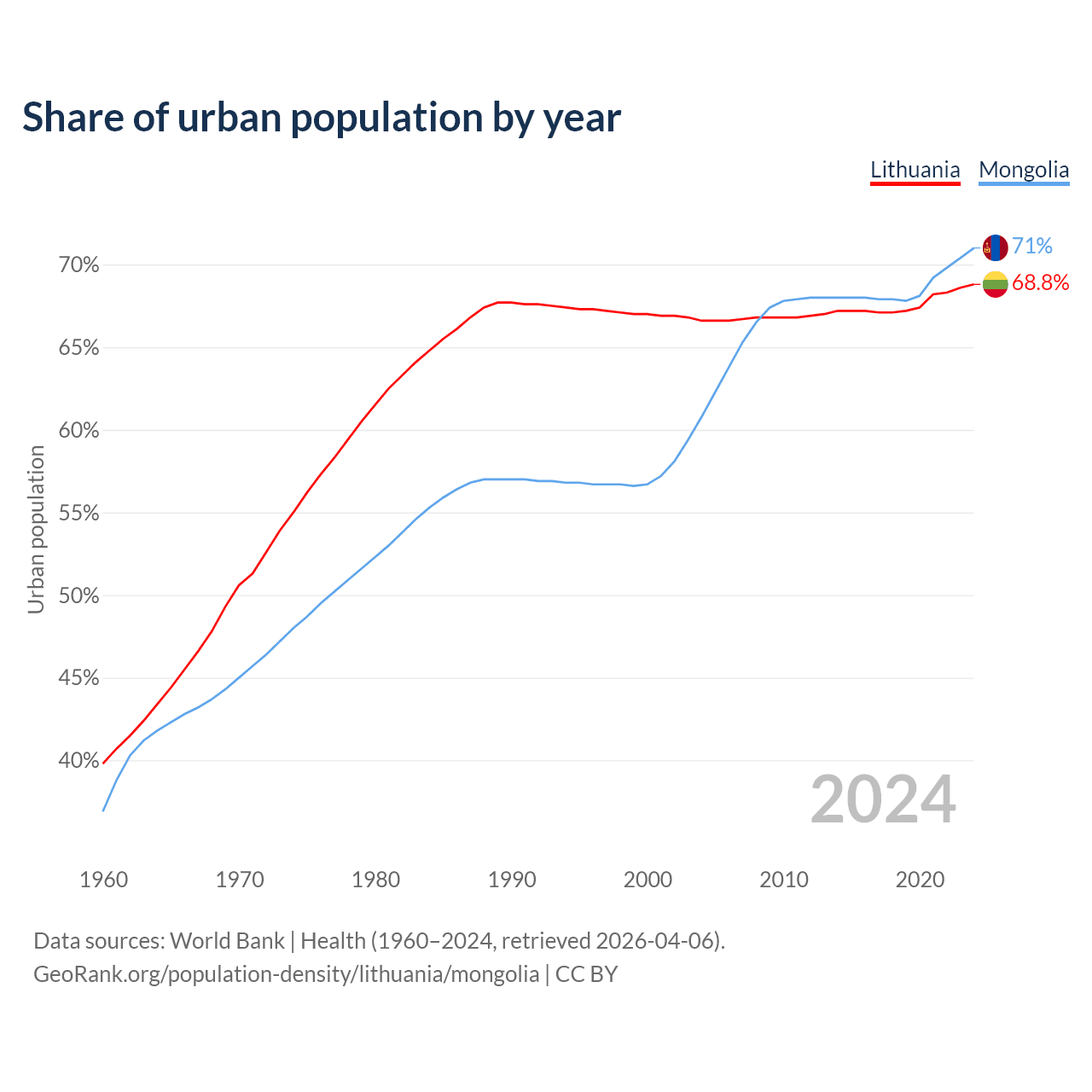 From 2004 to 2024, the share of urban population changed from 66.6% to 68.8% in Lithuania and from 60.8% to 71% in Mongolia.