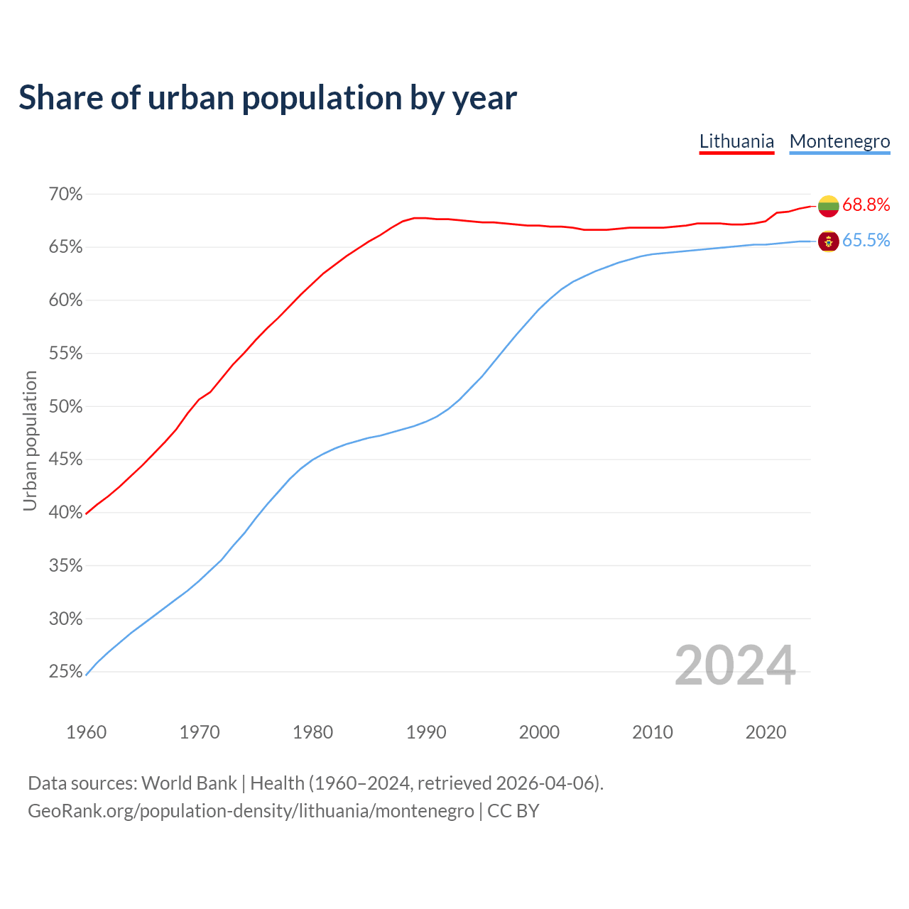 From 2004 to 2024, the share of urban population changed from 66.6% to 68.8% in Lithuania and from 62.2% to 65.5% in Montenegro.
