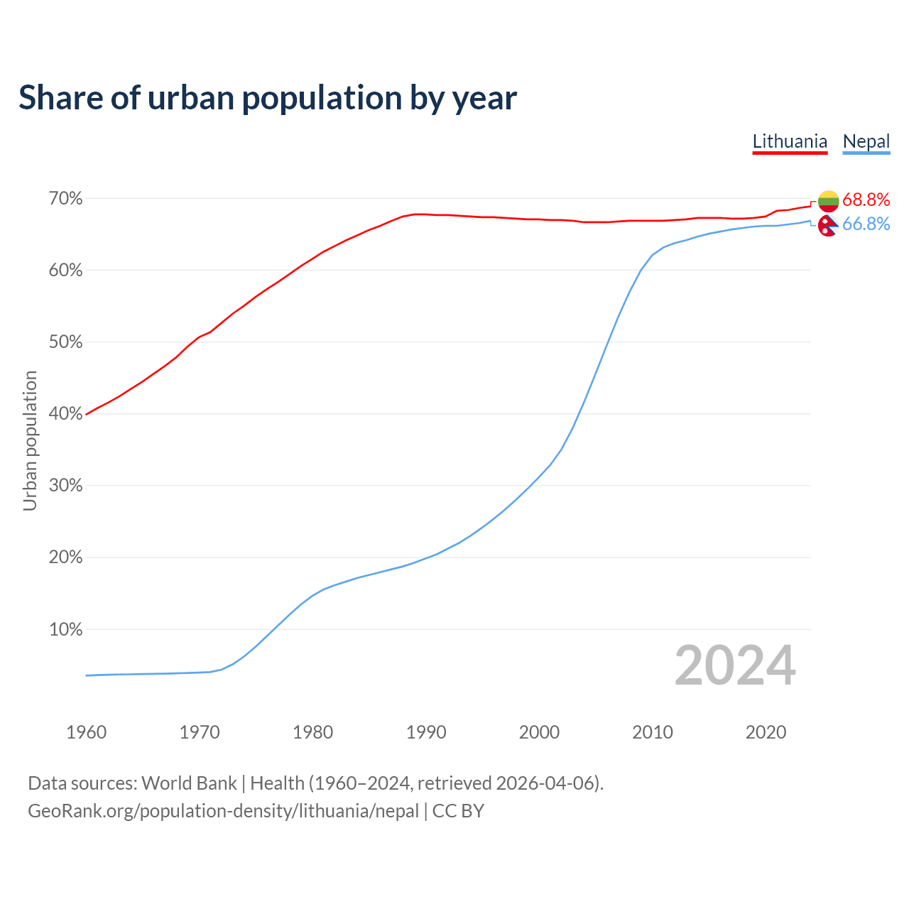 From 2004 to 2024, the share of urban population changed from 66.6% to 68.8% in Lithuania and from 41.6% to 66.8% in Nepal.