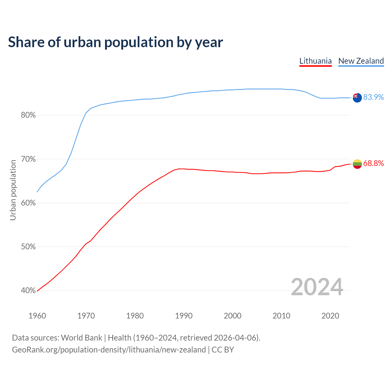 From 2004 to 2024, the share of urban population changed from 66.6% to 68.8% in Lithuania and from 85.9% to 83.9% in New Zealand.