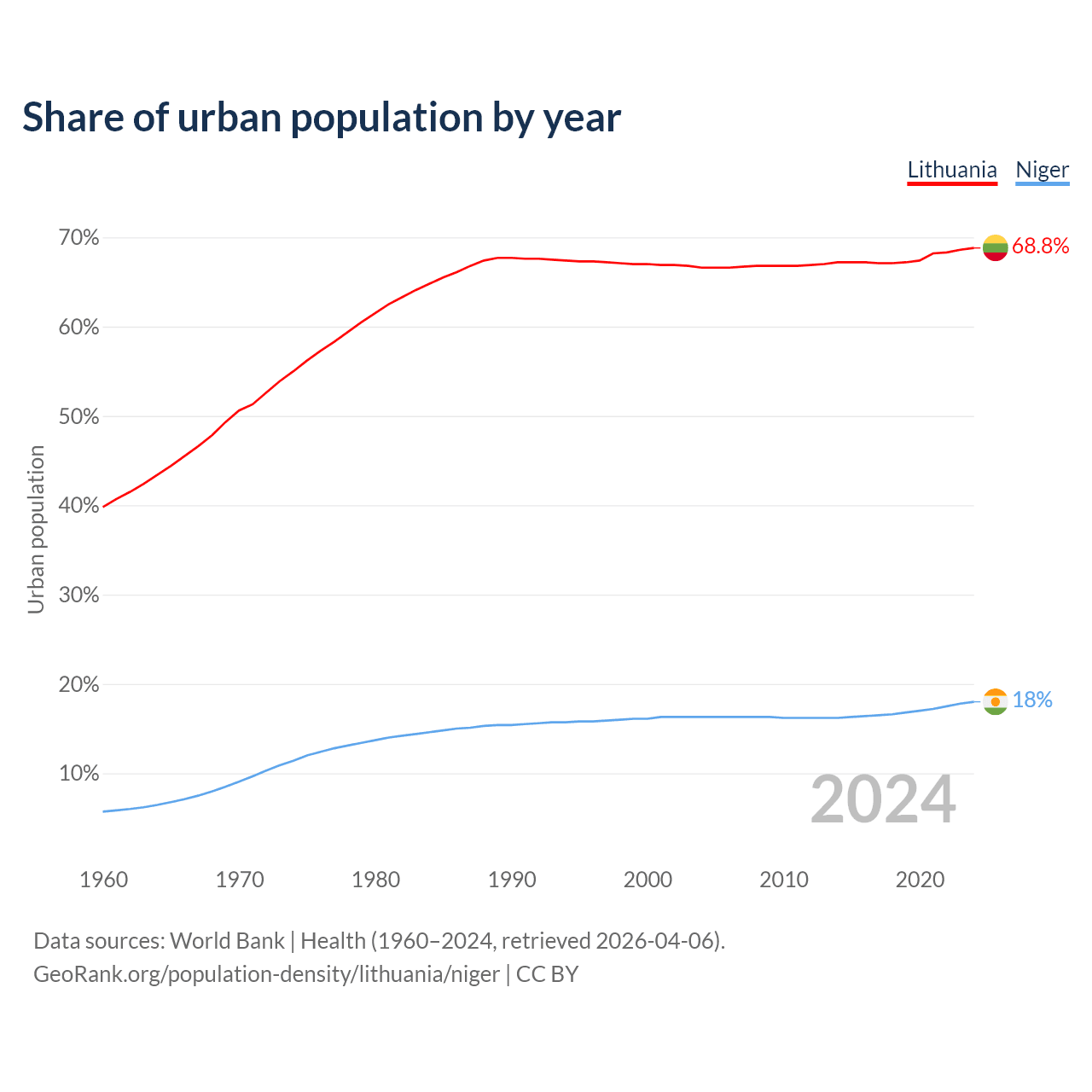 From 2004 to 2024, the share of urban population changed from 66.6% to 68.8% in Lithuania and from 16.3% to 18% in Niger.