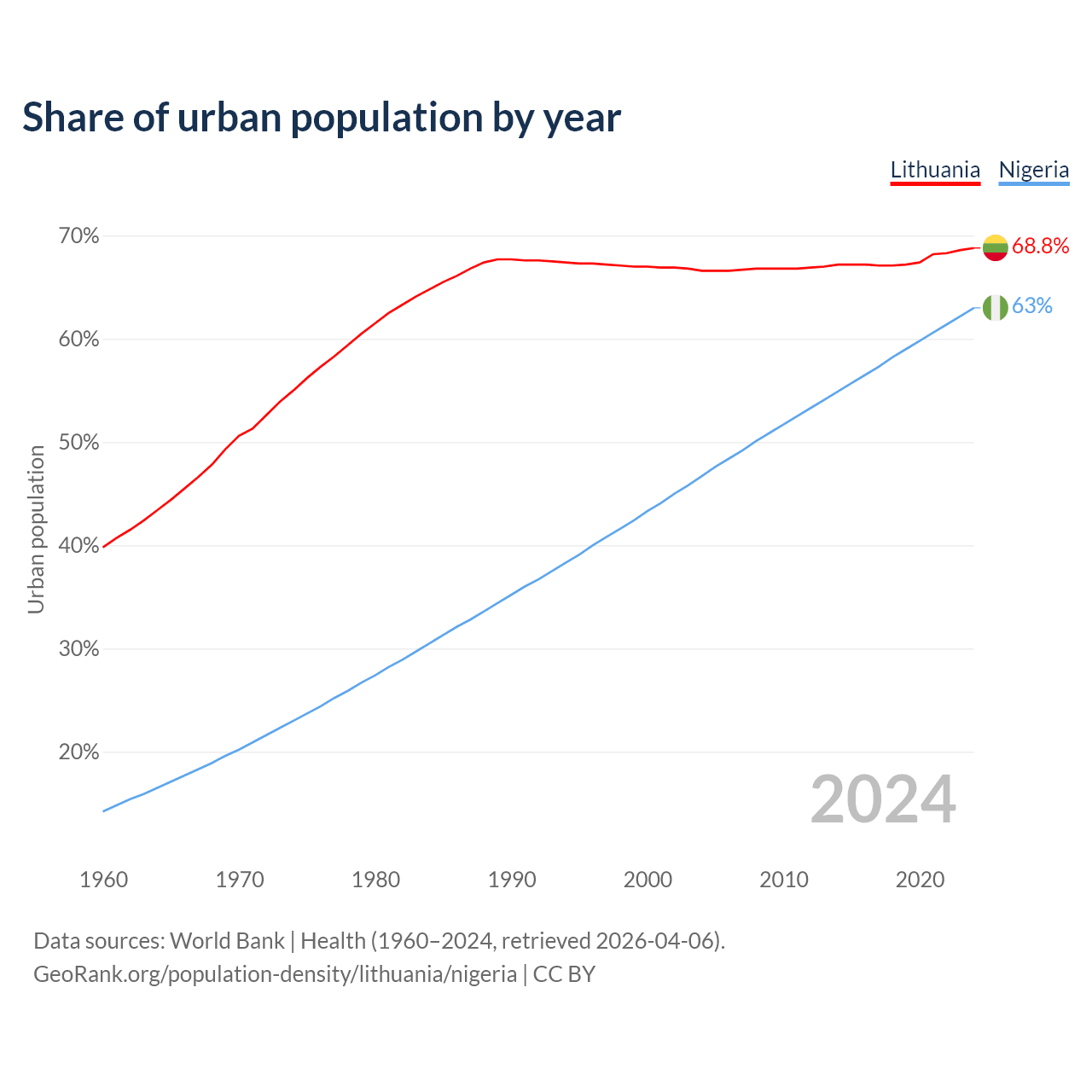 From 2004 to 2024, the share of urban population changed from 66.6% to 68.8% in Lithuania and from 46.7% to 63% in Nigeria.