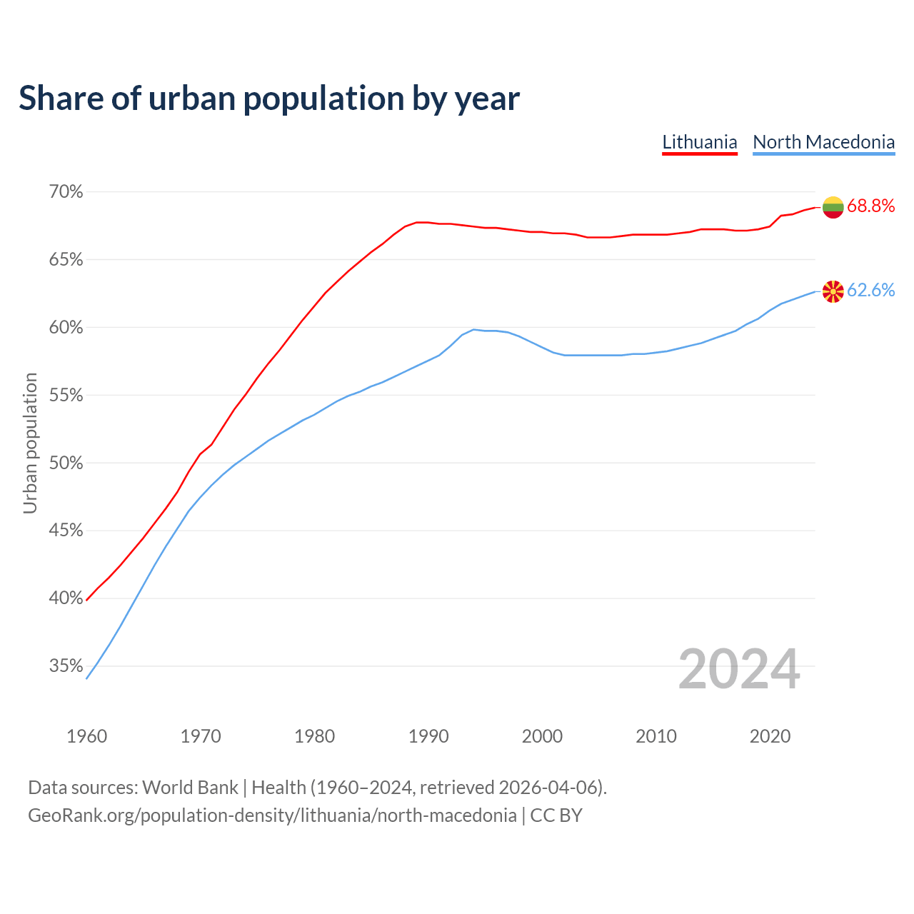 From 2004 to 2024, the share of urban population changed from 66.6% to 68.8% in Lithuania and from 57.9% to 62.6% in North Macedonia.