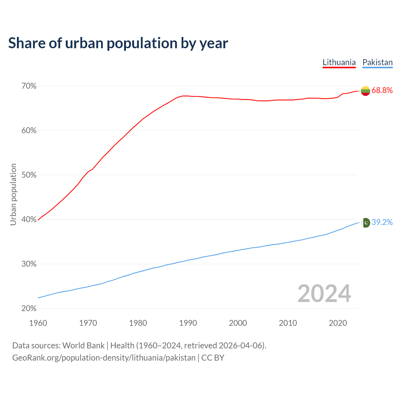 From 2004 to 2024, the share of urban population changed from 66.6% to 68.8% in Lithuania and from 33.7% to 39.2% in Pakistan.