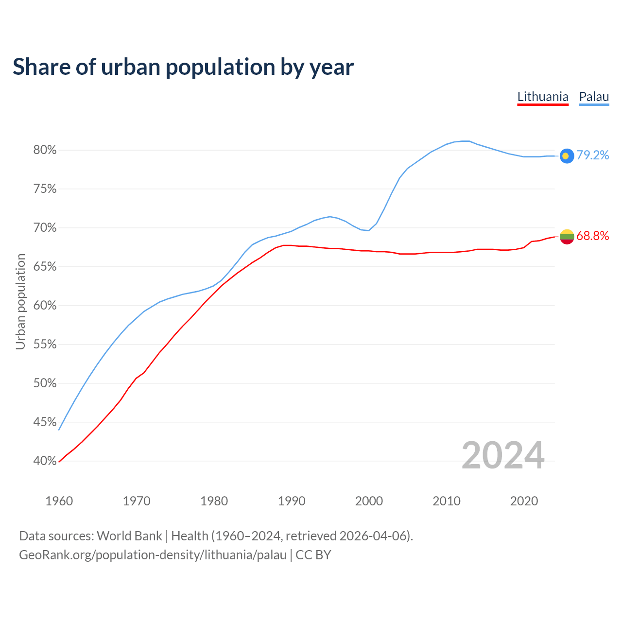 From 2004 to 2024, the share of urban population changed from 66.6% to 68.8% in Lithuania and from 76.4% to 79.2% in Palau.