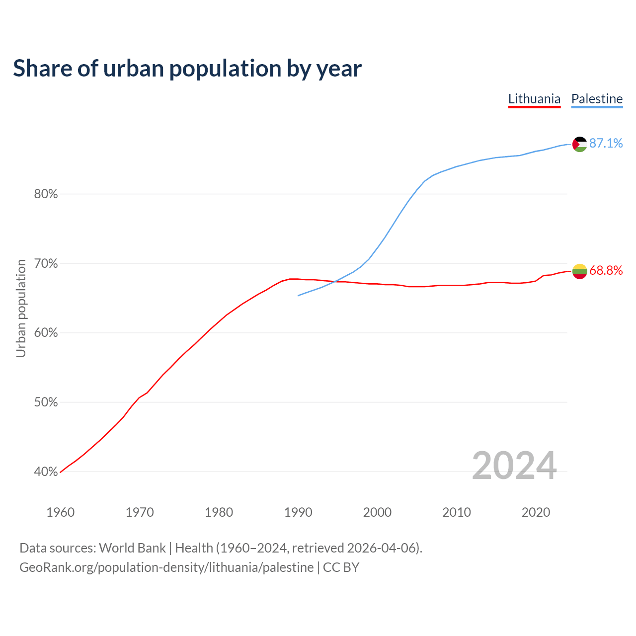 From 2004 to 2024, the share of urban population changed from 66.6% to 68.8% in Lithuania and from 79% to 87.1% in Palestine.