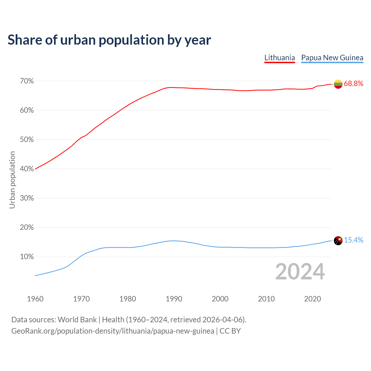 From 2004 to 2024, the share of urban population changed from 66.6% to 68.8% in Lithuania and from 13.1% to 15.4% in Papua New Guinea.