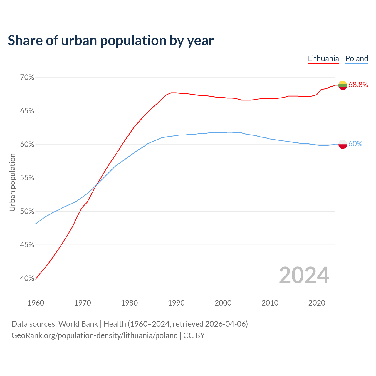 From 2004 to 2024, the share of urban population changed from 66.6% to 68.8% in Lithuania and from 61.7% to 60% in Poland.
