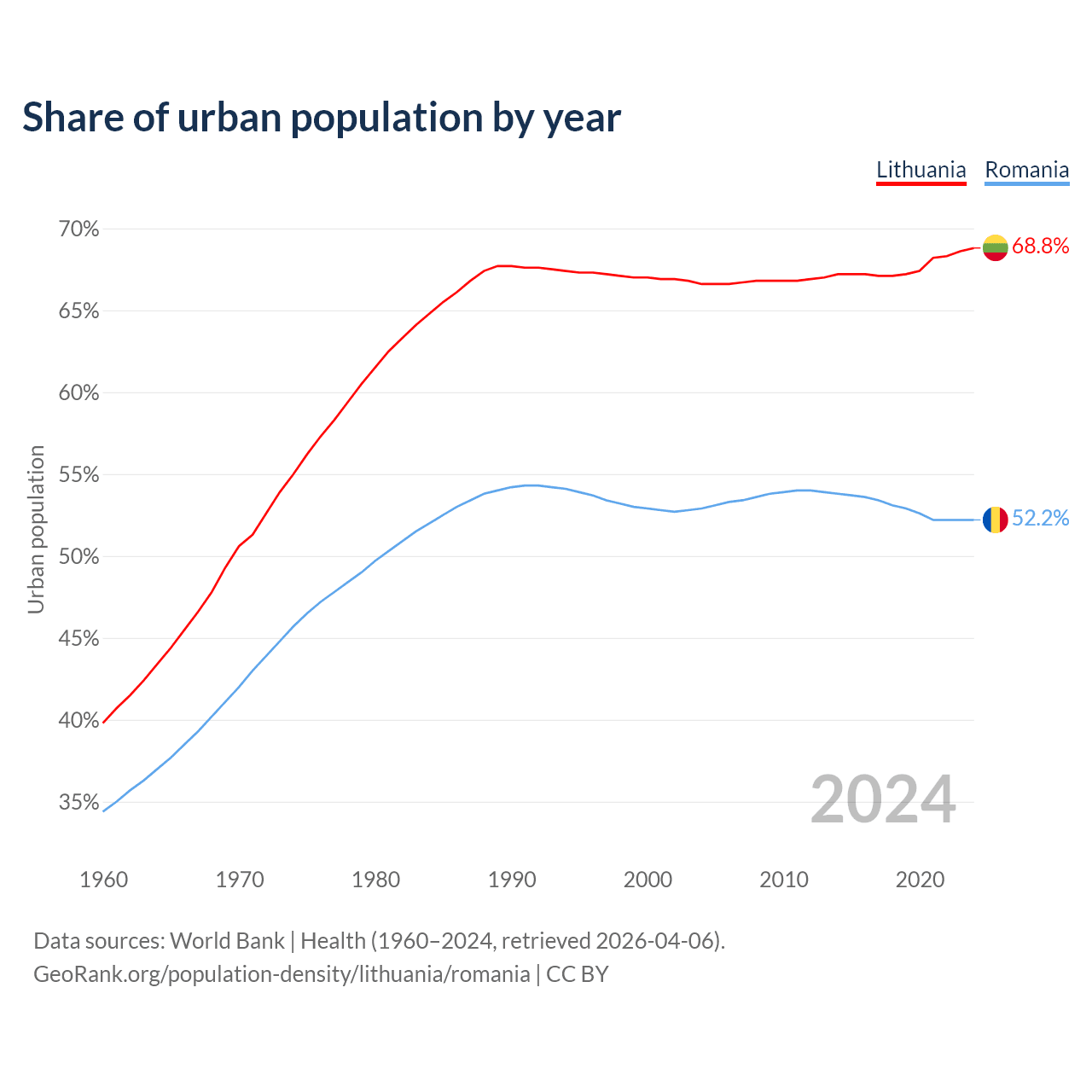 From 2004 to 2024, the share of urban population changed from 66.6% to 68.8% in Lithuania and from 52.9% to 52.2% in Romania.