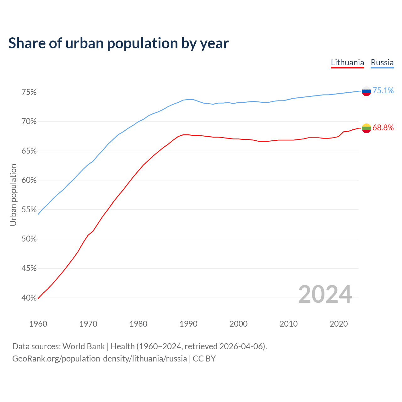 From 2004 to 2024, the share of urban population changed from 66.6% to 68.8% in Lithuania and from 73.3% to 75.1% in Russia.