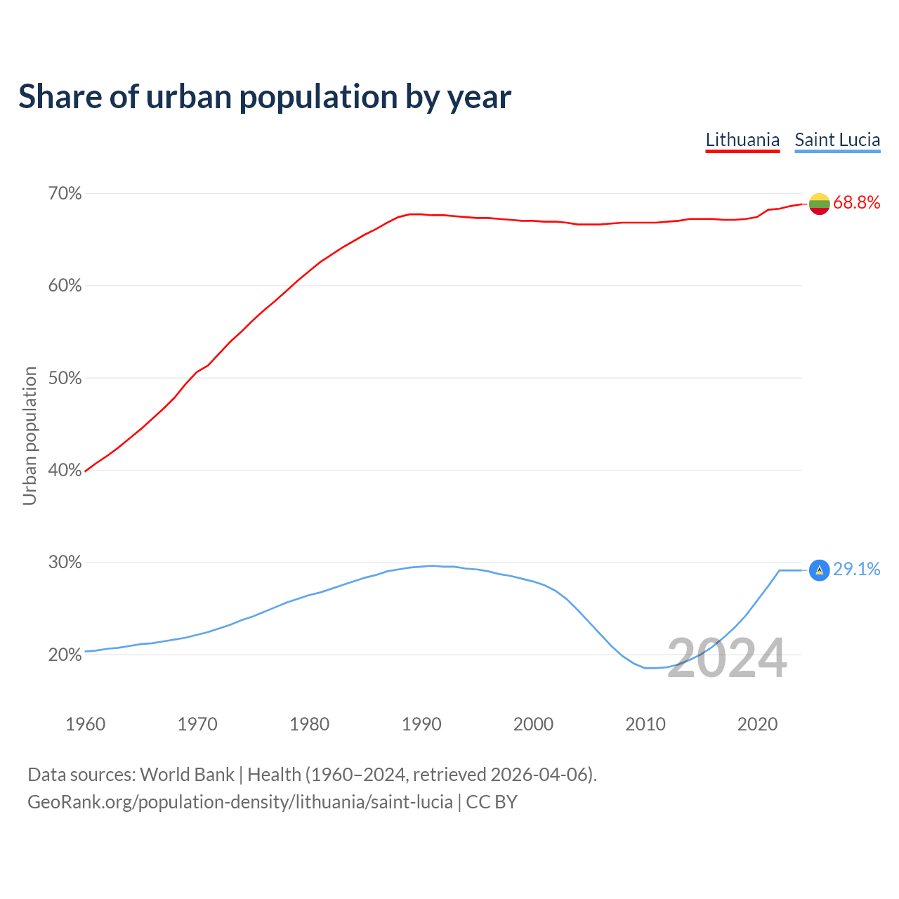 From 2004 to 2024, the share of urban population changed from 66.6% to 68.8% in Lithuania and from 24.8% to 29.1% in Saint Lucia.