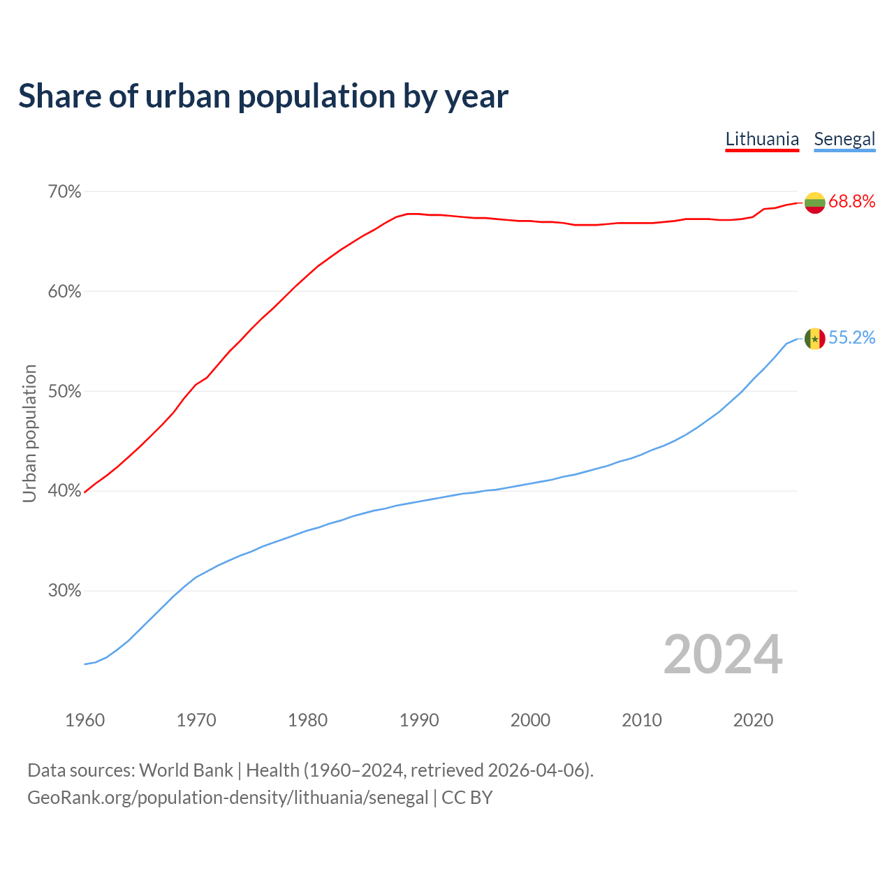 From 2004 to 2024, the share of urban population changed from 66.6% to 68.8% in Lithuania and from 41.6% to 55.2% in Senegal.
