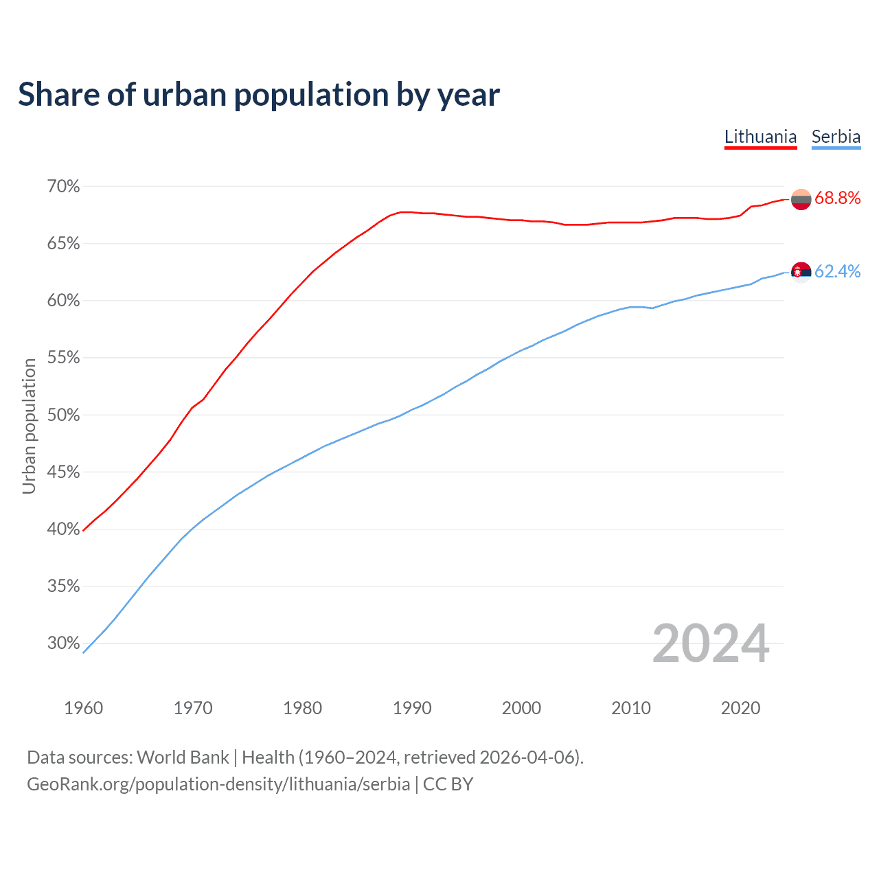 From 2004 to 2024, the share of urban population changed from 66.6% to 68.8% in Lithuania and from 57.3% to 62.4% in Serbia.