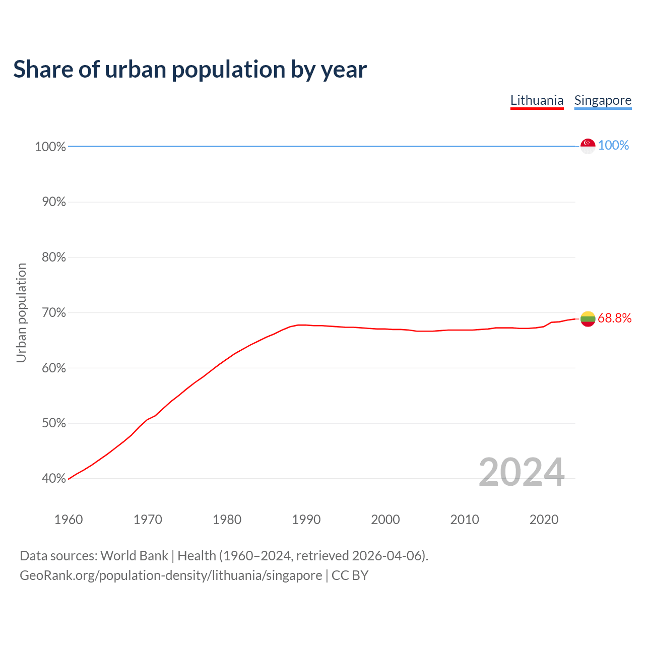 From 2004 to 2024, the share of urban population changed from 66.6% to 68.8% in Lithuania and from 100% to 100% in Singapore.
