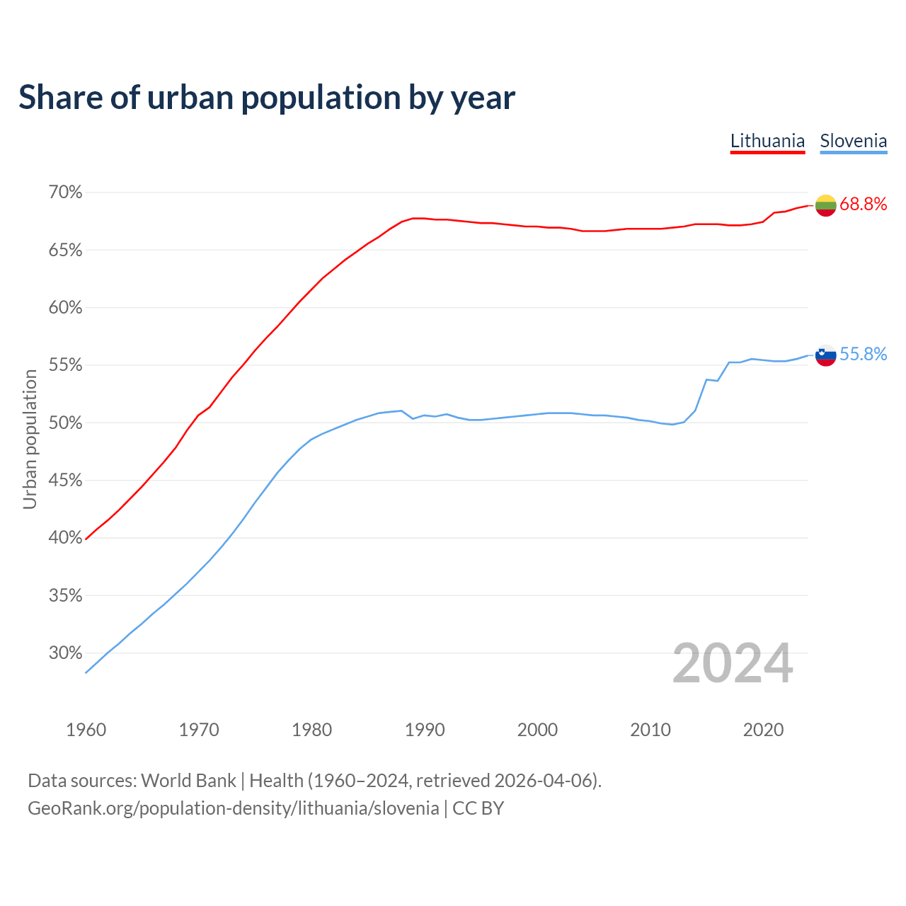 From 2004 to 2024, the share of urban population changed from 66.6% to 68.8% in Lithuania and from 50.7% to 55.8% in Slovenia.