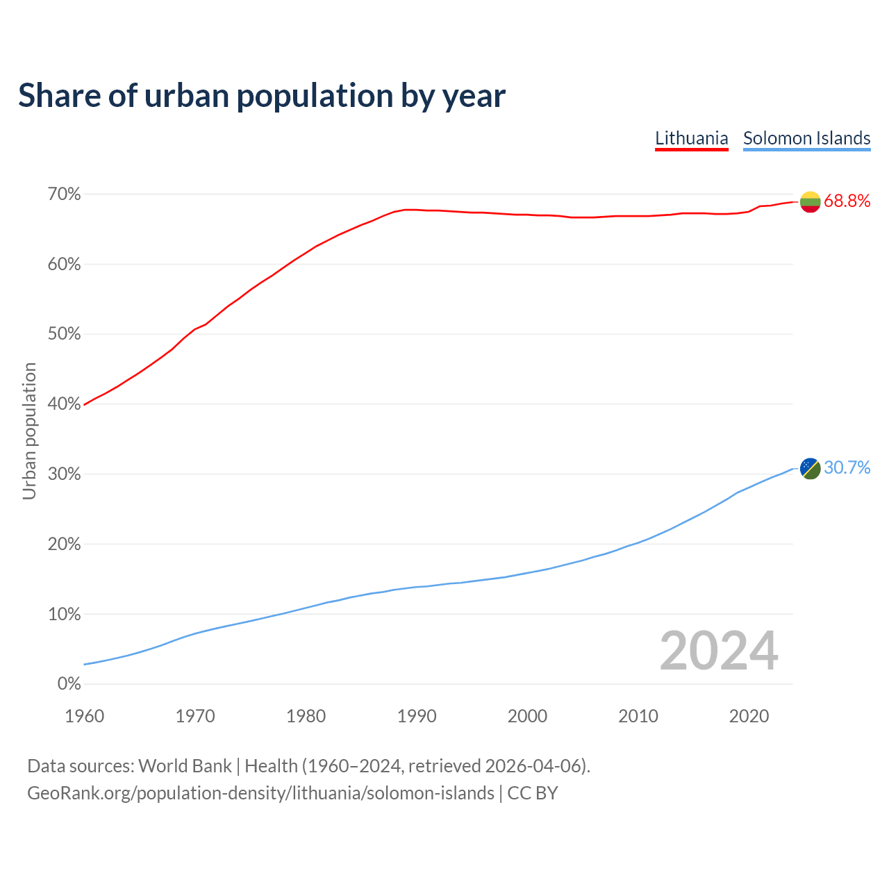 From 2004 to 2024, the share of urban population changed from 66.6% to 68.8% in Lithuania and from 17.2% to 30.7% in the Solomon Islands.
