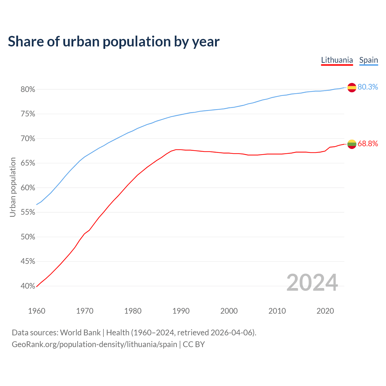From 2004 to 2024, the share of urban population changed from 66.6% to 68.8% in Lithuania and from 77% to 80.3% in Spain.