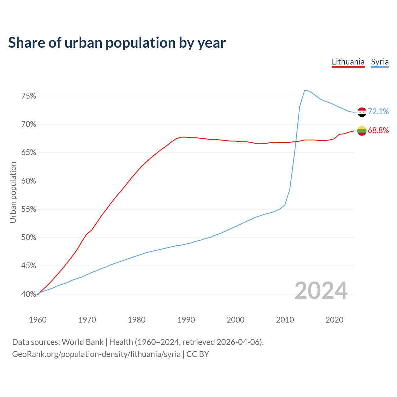 From 2004 to 2024, the share of urban population changed from 66.6% to 68.8% in Lithuania and from 53.5% to 72.1% in Syria.