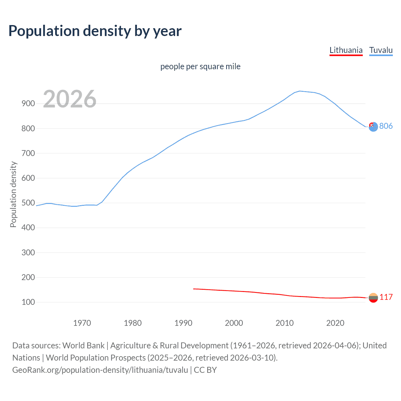 From 2006 to 2026, population density in Lithuania decreased by 13.3%, compared to a 7.1% decline in Tuvalu.