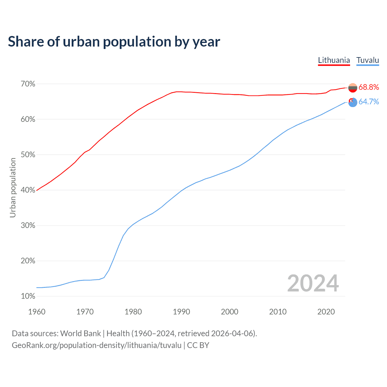 From 2004 to 2024, the share of urban population changed from 66.6% to 68.8% in Lithuania and from 48.4% to 64.7% in Tuvalu.