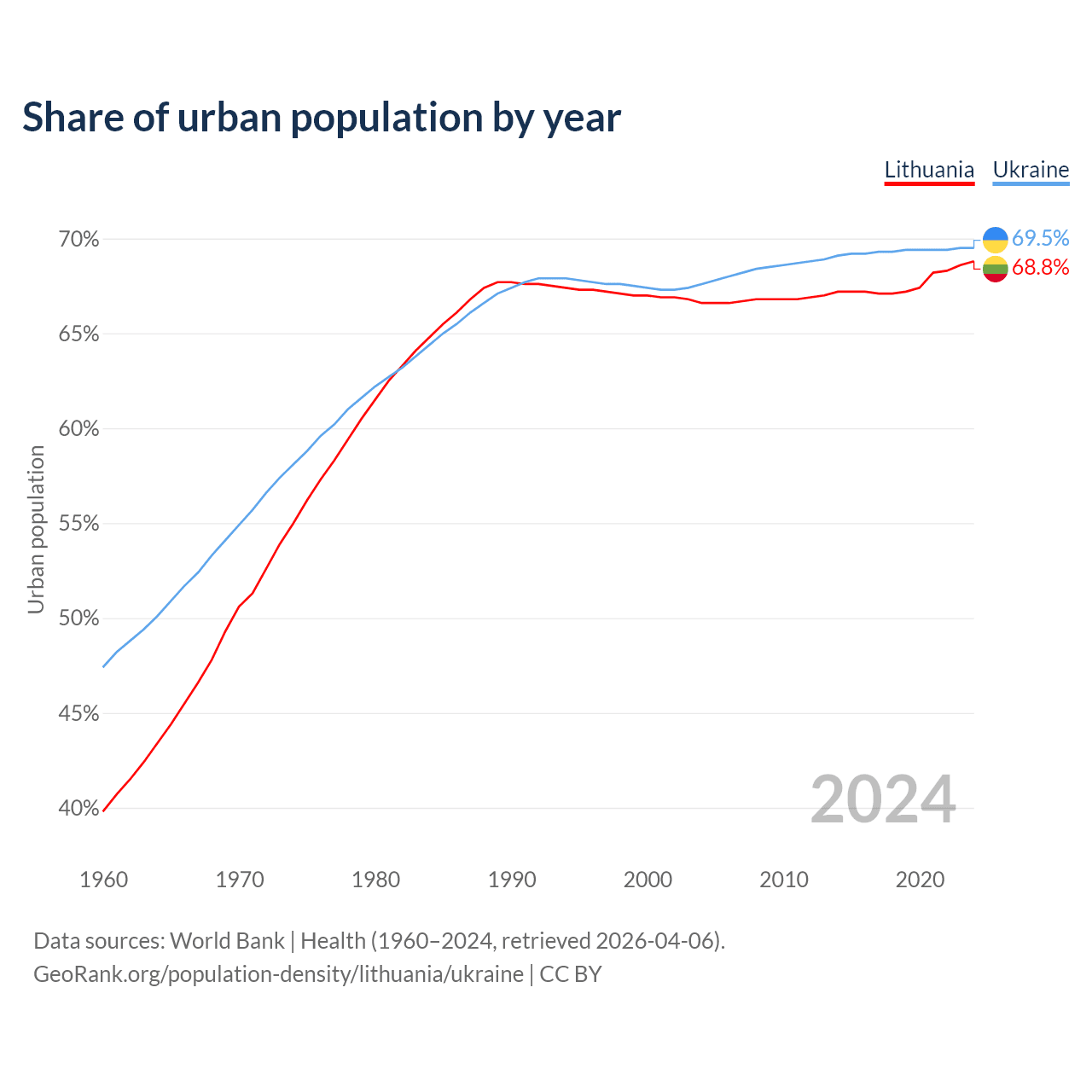 From 2004 to 2024, the share of urban population changed from 66.6% to 68.8% in Lithuania and from 67.6% to 69.5% in Ukraine.