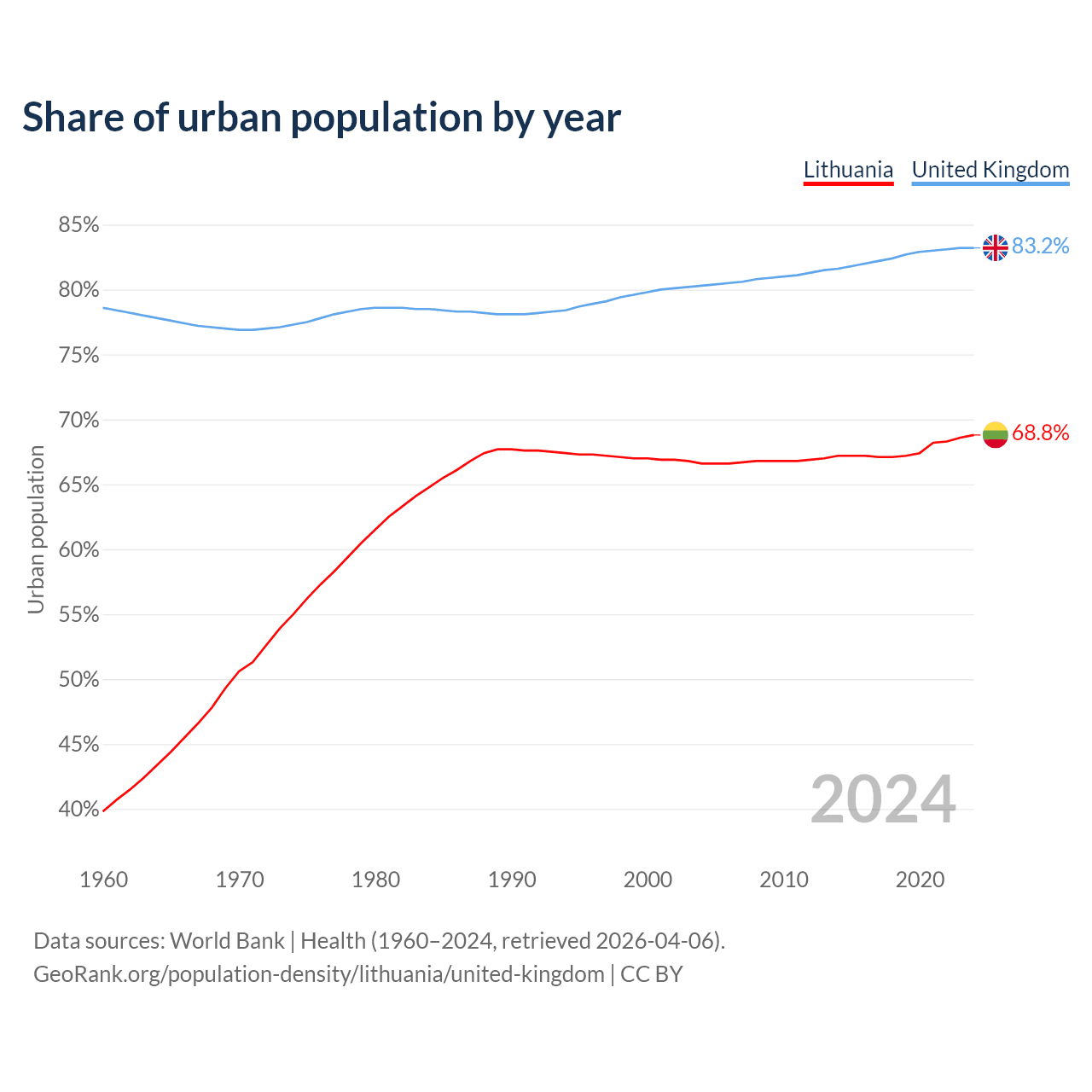 From 2004 to 2024, the share of urban population changed from 66.6% to 68.8% in Lithuania and from 80.3% to 83.2% in the United Kingdom.
