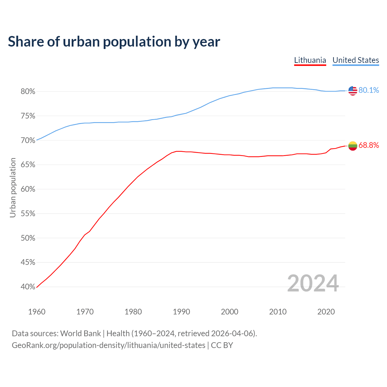 From 2004 to 2024, the share of urban population changed from 66.6% to 68.8% in Lithuania and from 80% to 80.1% in the United States.