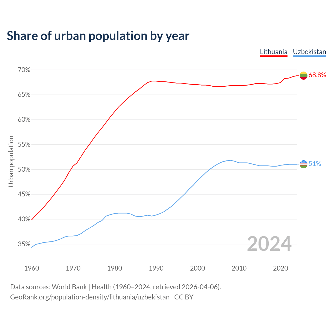 From 2004 to 2024, the share of urban population changed from 66.6% to 68.8% in Lithuania and from 50.6% to 51% in Uzbekistan.