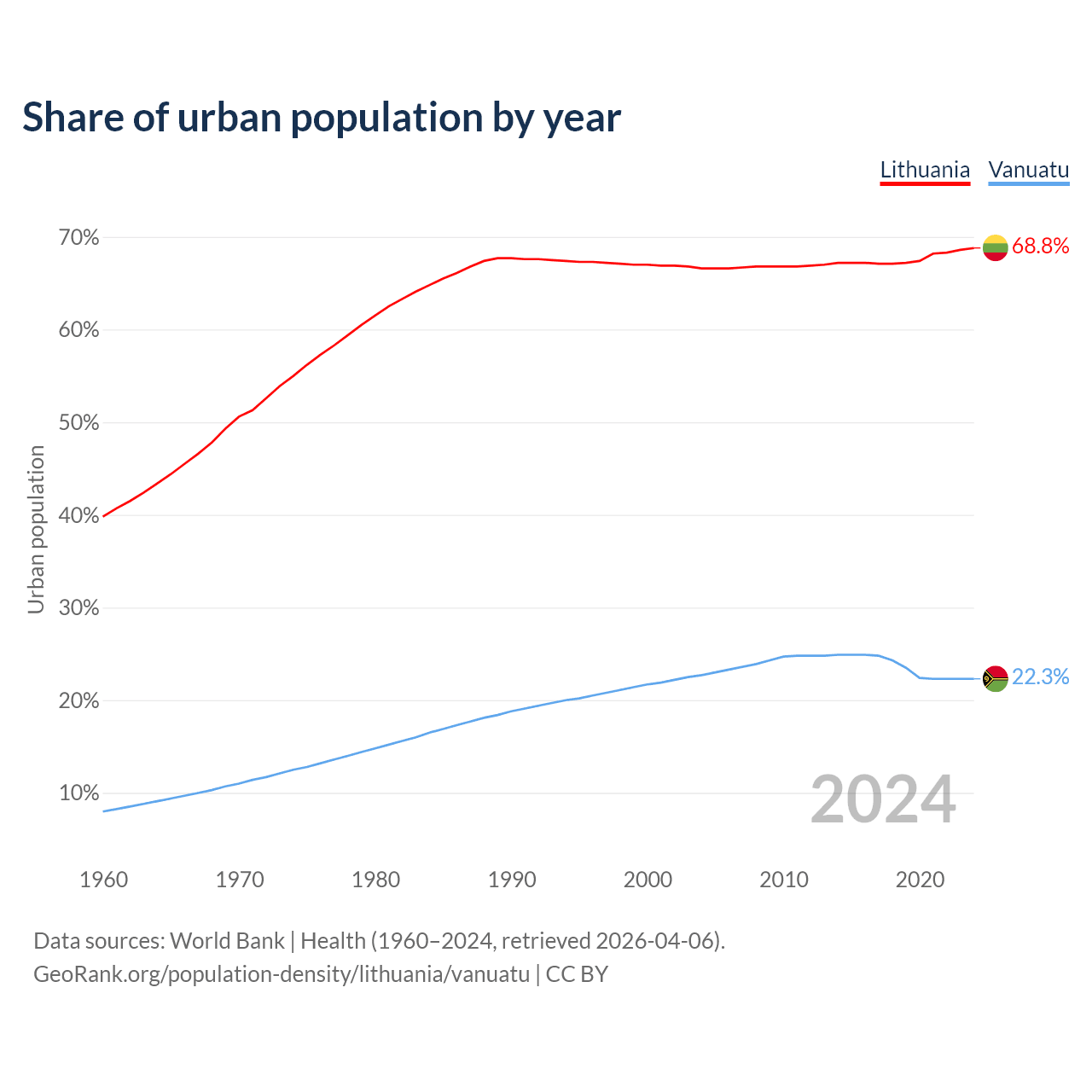 From 2006 to 2026, population density in Lithuania decreased by 13.3%, compared to a 58.7% growth in Vanuatu.