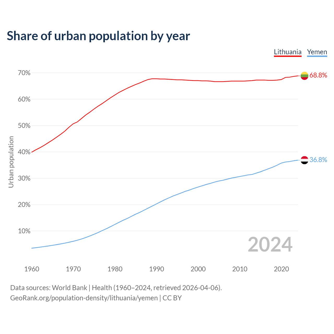 From 2004 to 2024, the share of urban population changed from 66.6% to 68.8% in Lithuania and from 28.5% to 36.8% in Yemen.