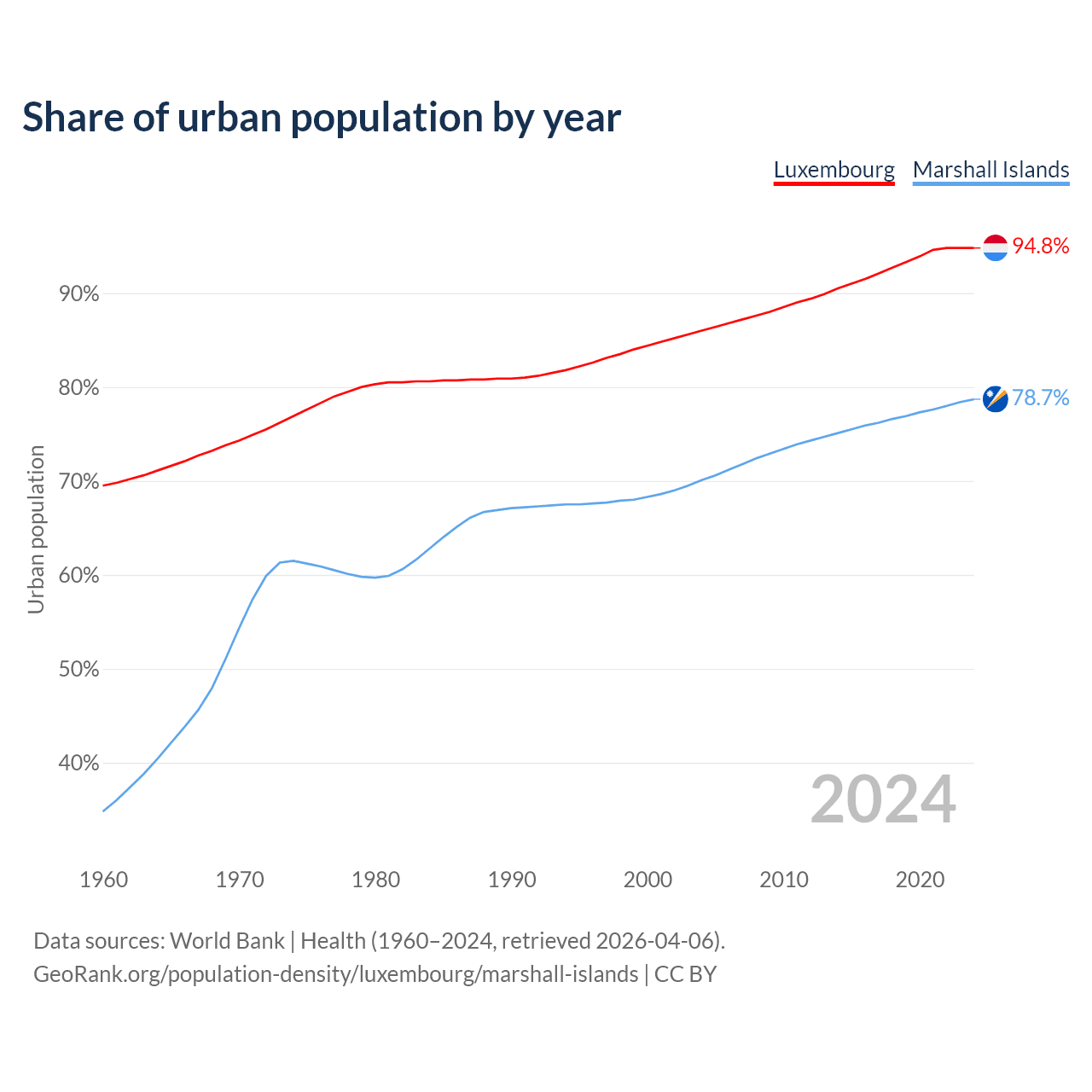 From 2004 to 2024, the share of urban population changed from 86% to 94.8% in Luxembourg and from 70.1% to 78.7% in the Marshall Islands.
