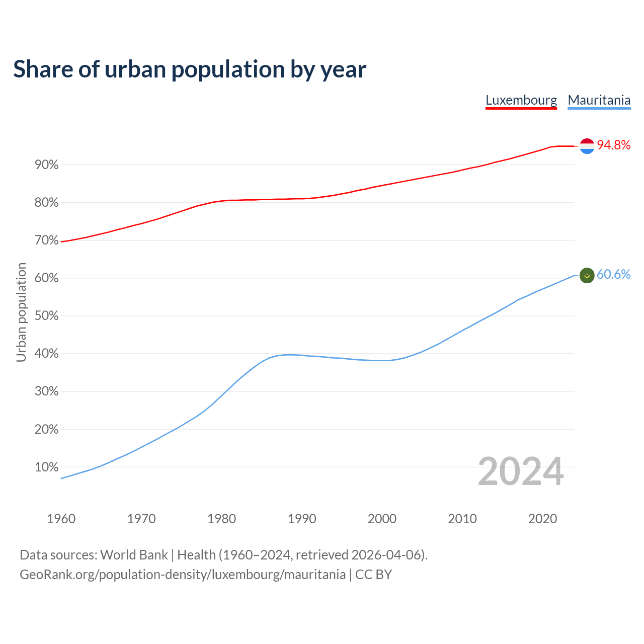 From 2004 to 2024, the share of urban population changed from 86% to 94.8% in Luxembourg and from 39.6% to 60.6% in Mauritania.
