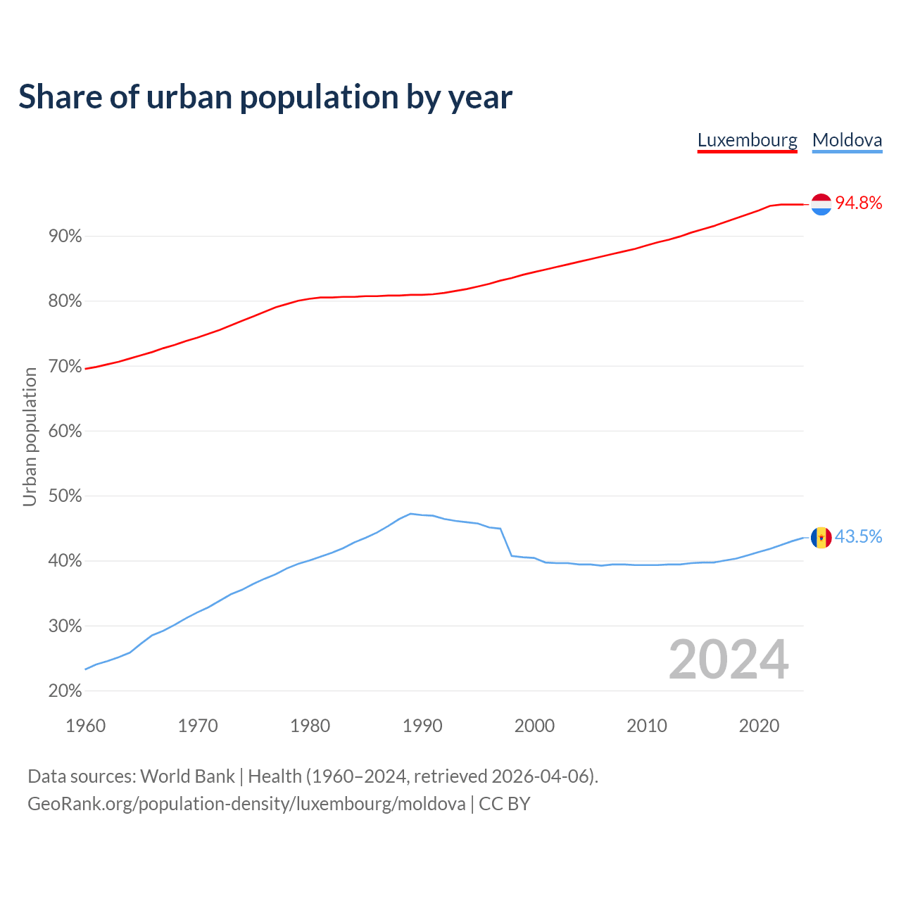 From 2004 to 2024, the share of urban population changed from 86% to 94.8% in Luxembourg and from 39.4% to 43.5% in Moldova.