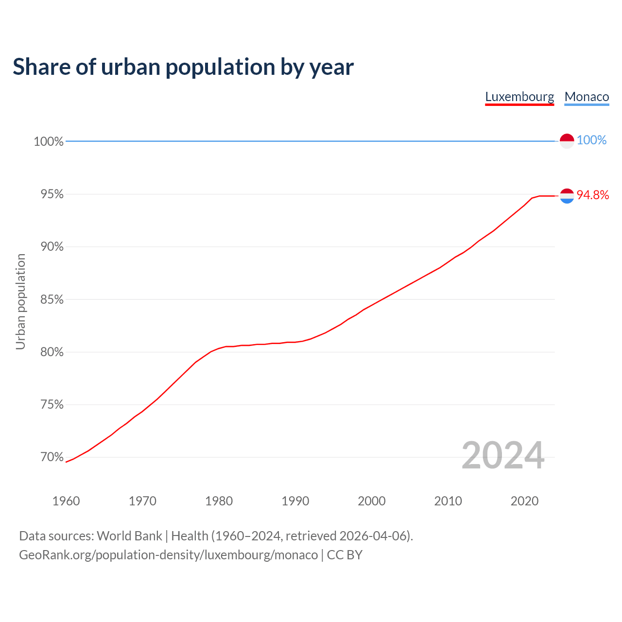 From 2004 to 2024, the share of urban population changed from 86% to 94.8% in Luxembourg and from 100% to 100% in Monaco.