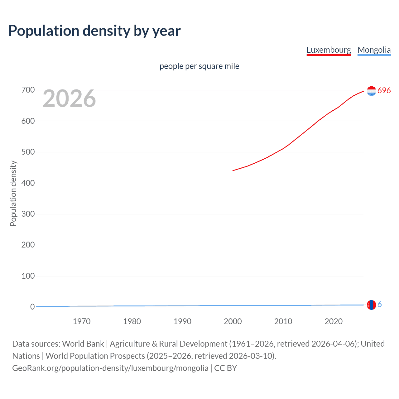 From 2006 to 2026, population density in Luxembourg increased by 46.4%, compared to a 40.5% growth in Mongolia.