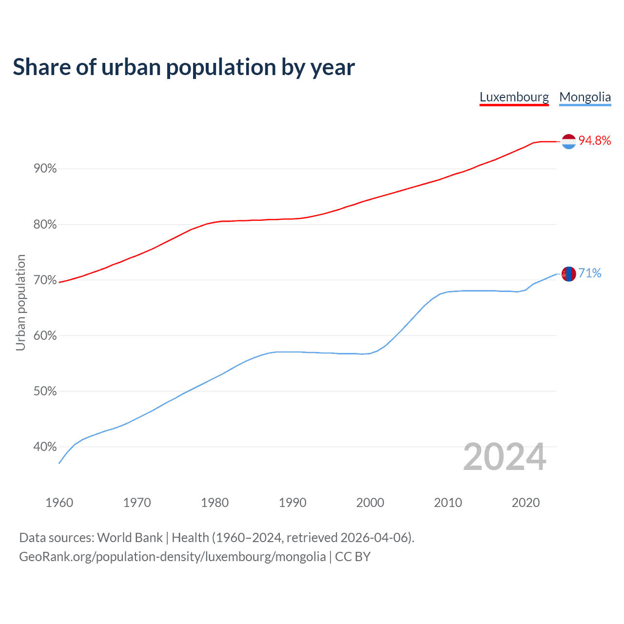 From 2004 to 2024, the share of urban population changed from 86% to 94.8% in Luxembourg and from 60.8% to 71% in Mongolia.