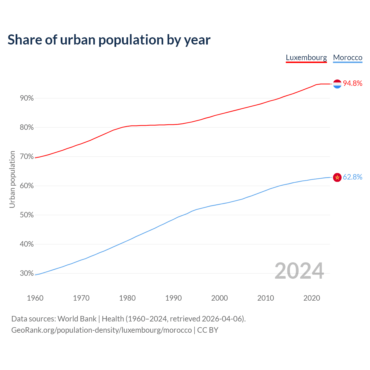 From 2004 to 2024, the share of urban population changed from 86% to 94.8% in Luxembourg and from 55% to 62.8% in Morocco.