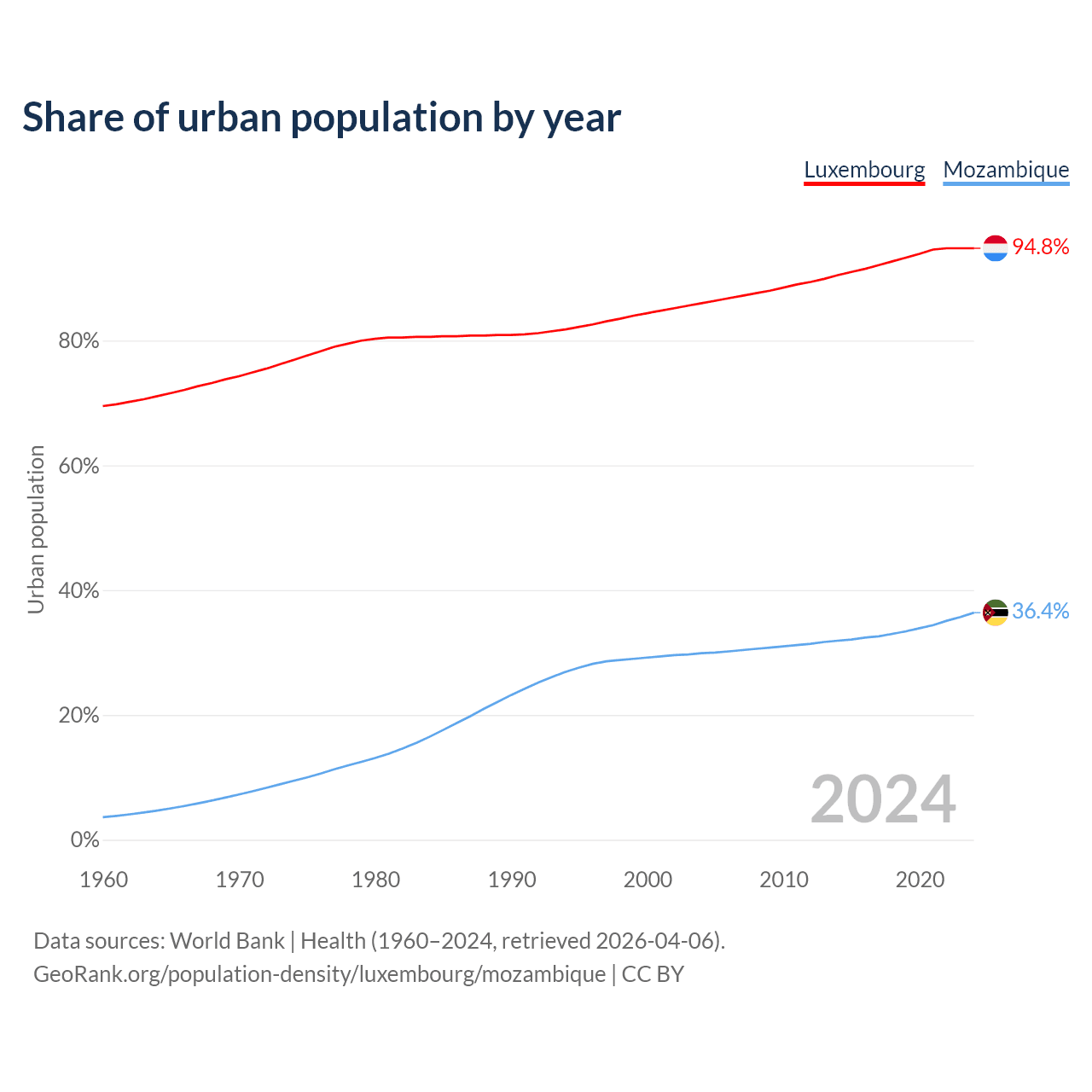 From 2006 to 2026, population density in Luxembourg increased by 46.4%, compared to a 76.4% growth in Mozambique.