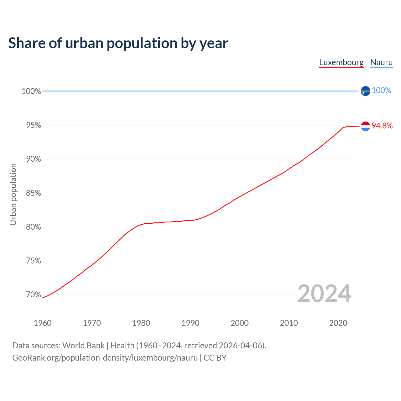 From 2004 to 2024, the share of urban population changed from 86% to 94.8% in Luxembourg and from 100% to 100% in Nauru.