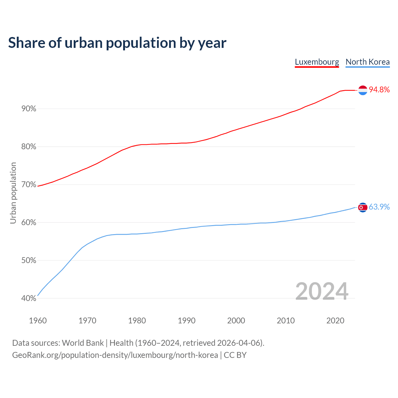From 2004 to 2024, the share of urban population changed from 86% to 94.8% in Luxembourg and from 59.7% to 63.9% in North Korea.