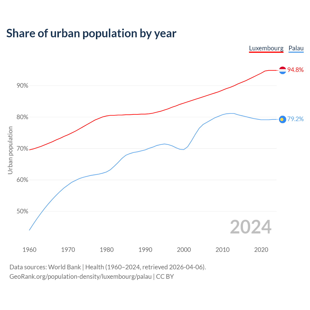From 2004 to 2024, the share of urban population changed from 86% to 94.8% in Luxembourg and from 76.4% to 79.2% in Palau.