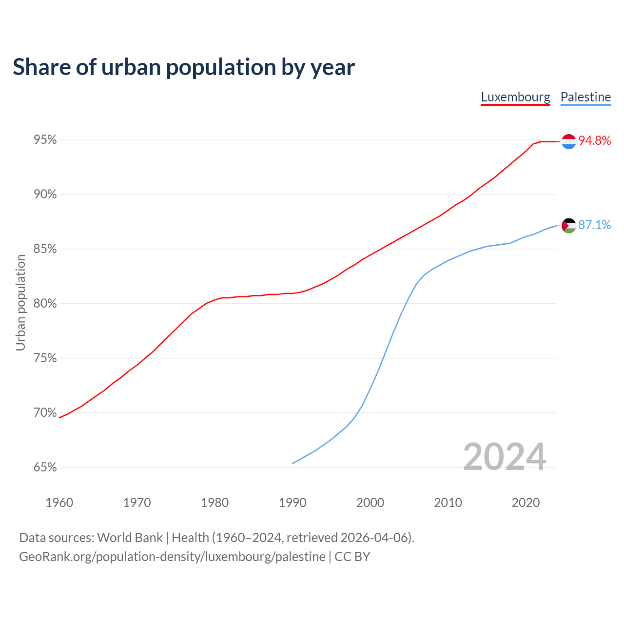 From 2004 to 2024, the share of urban population changed from 86% to 94.8% in Luxembourg and from 79% to 87.1% in Palestine.