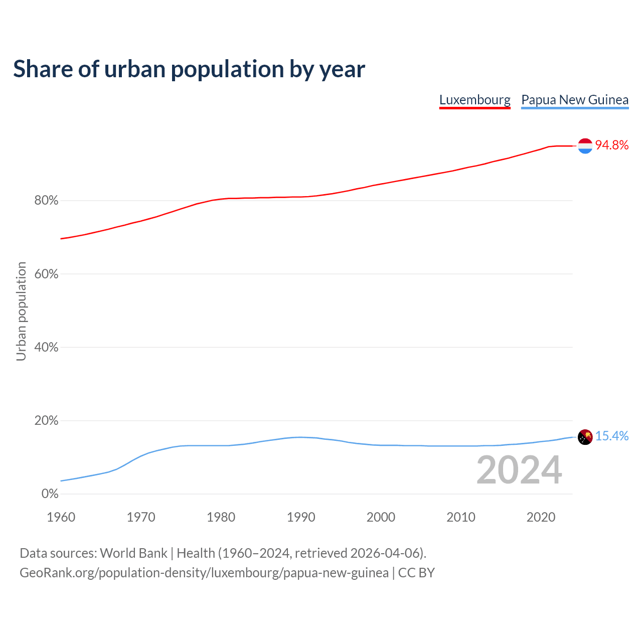 From 2004 to 2024, the share of urban population changed from 86% to 94.8% in Luxembourg and from 13.1% to 15.4% in Papua New Guinea.
