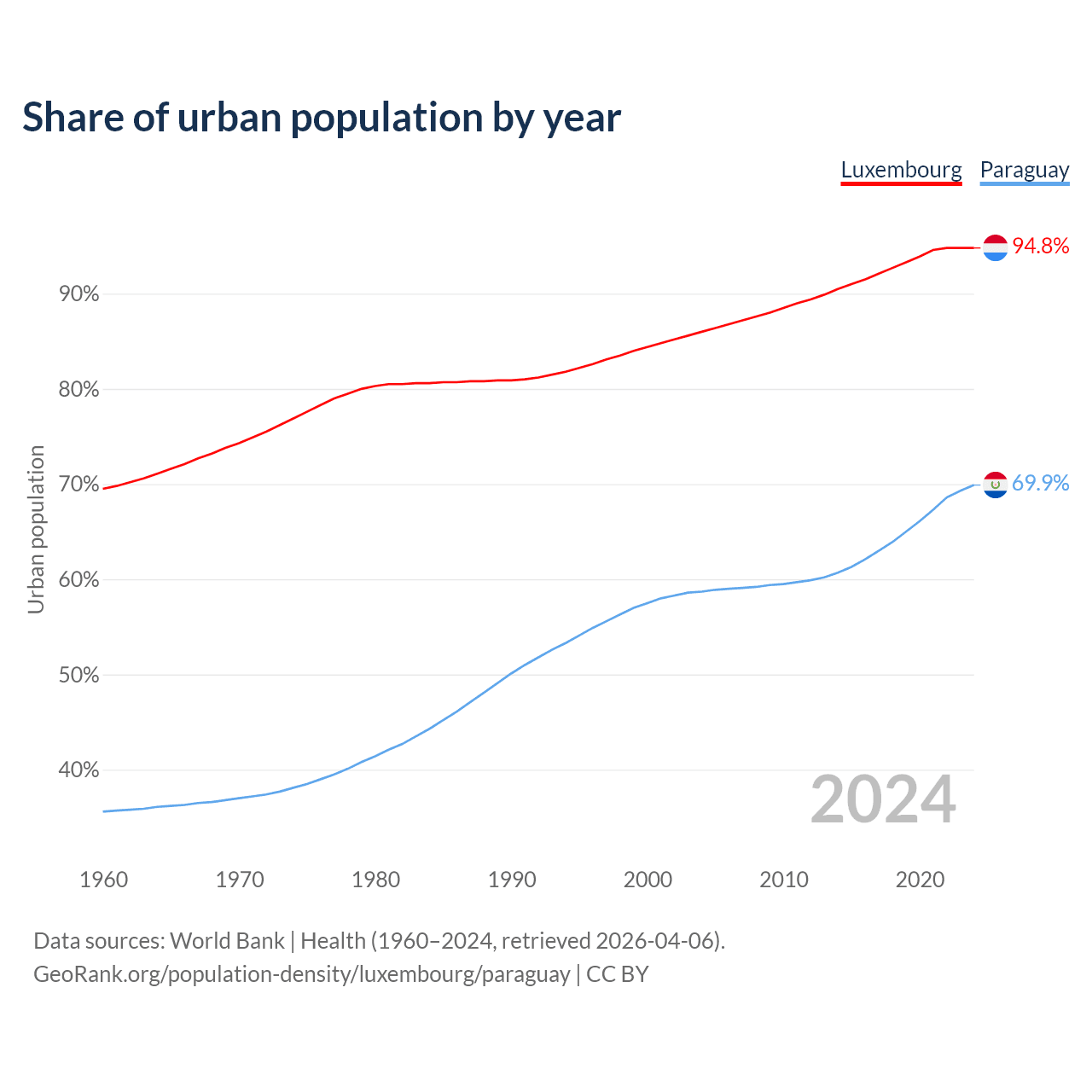 From 2004 to 2024, the share of urban population changed from 86% to 94.8% in Luxembourg and from 58.7% to 69.9% in Paraguay.