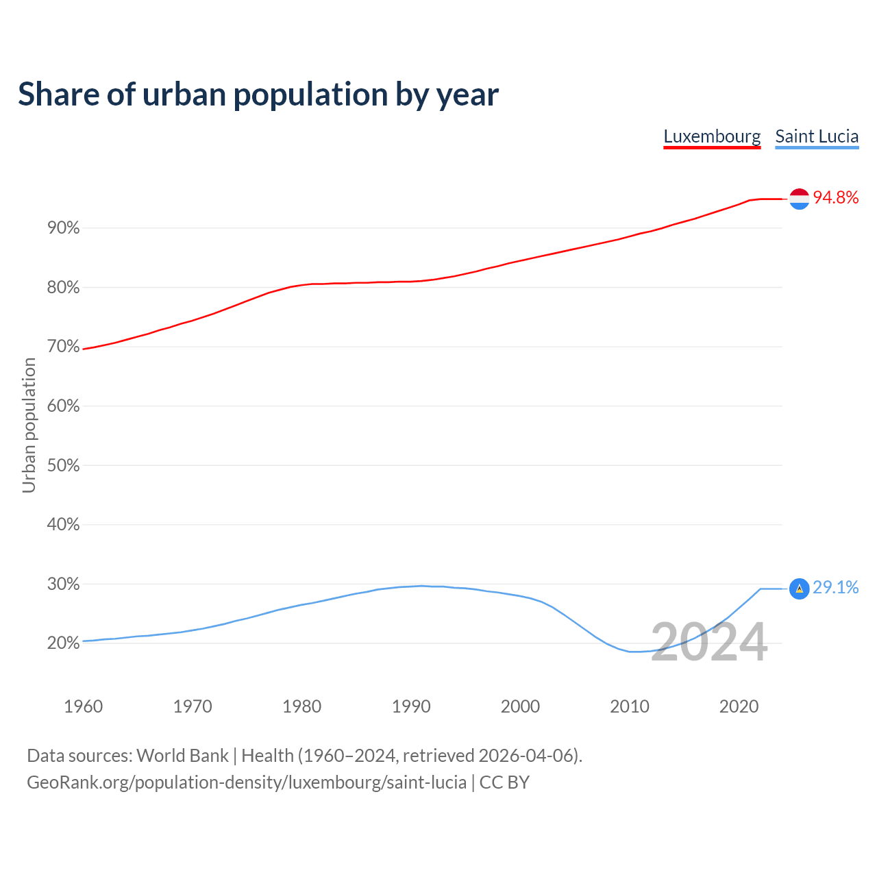 From 2004 to 2024, the share of urban population changed from 86% to 94.8% in Luxembourg and from 24.8% to 29.1% in Saint Lucia.