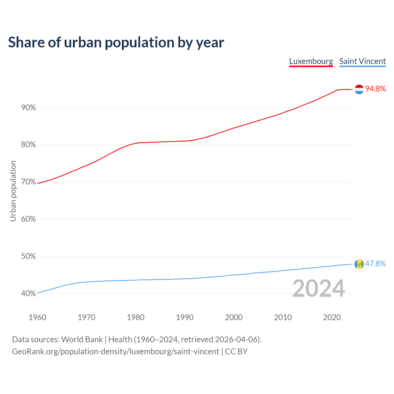 From 2004 to 2024, the share of urban population changed from 86% to 94.8% in Luxembourg and from 45.4% to 47.8% in Saint Vincent.