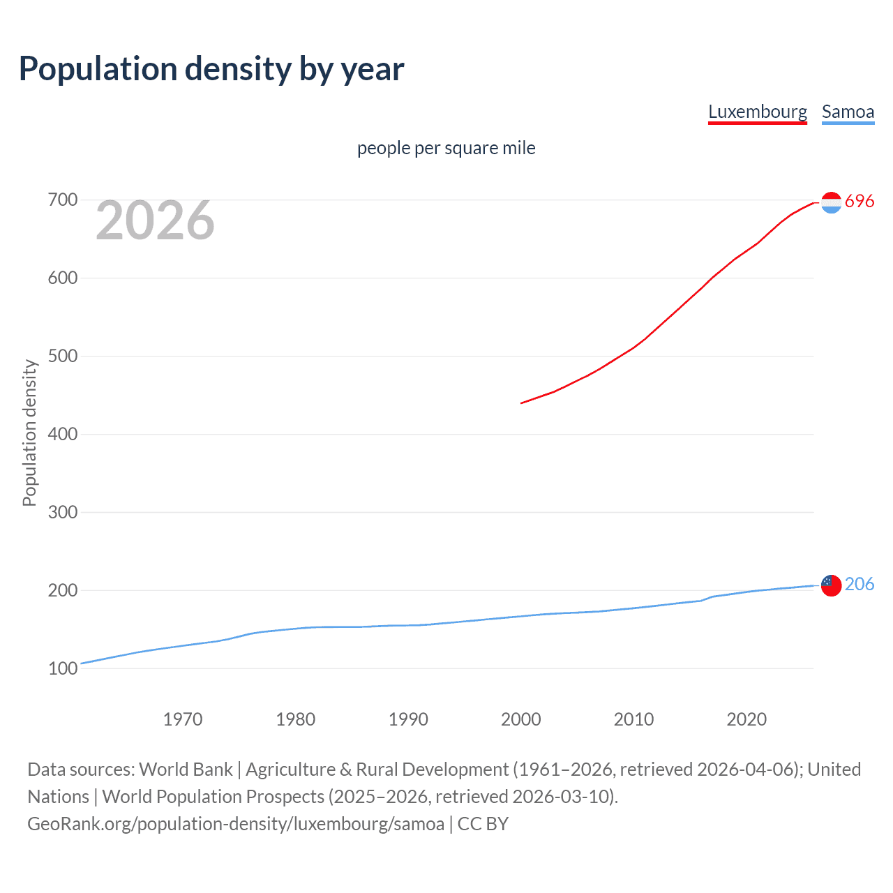 From 2006 to 2026, population density in Luxembourg increased by 46.4%, compared to a 19.6% growth in Samoa.