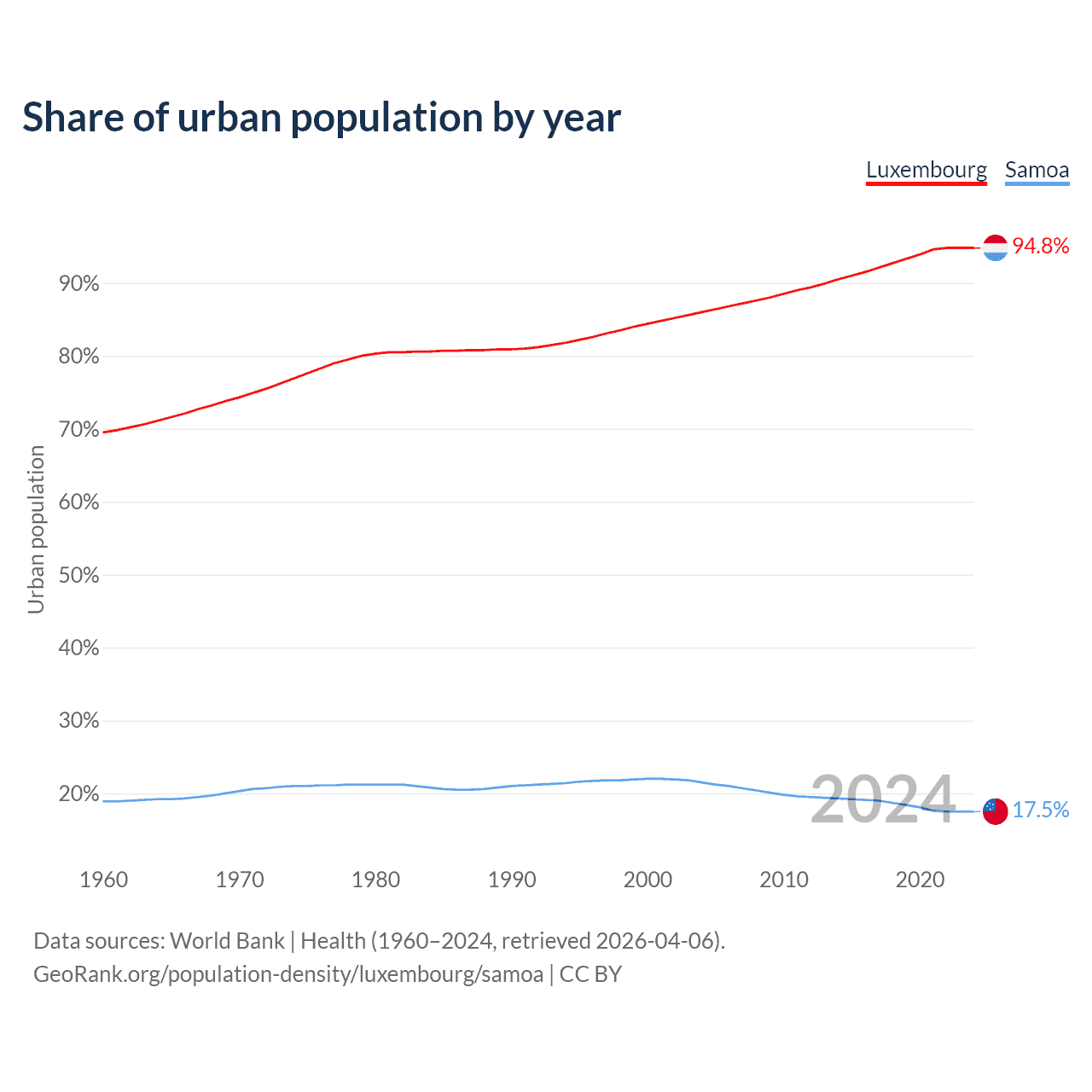 From 2004 to 2024, the share of urban population changed from 86% to 94.8% in Luxembourg and from 21.5% to 17.5% in Samoa.